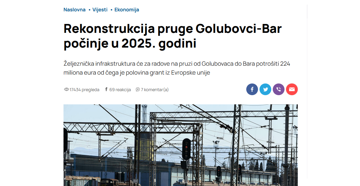 Rekonstrukcija pruge Golubovci–Bar počinje u 2025. godini