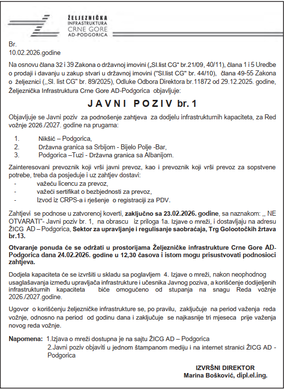 Javni poziv za podnošenje zahtjeva za dodjelu infrastrukturnih kapaciteta za red vožnje 2026/2027. godine. https://beta.zicg.me/javni-poziv-za-podnosenje-zahtjeva-za-dodjelu-infrastrukturnih-kapaciteta-za-red-voznje-2026-2027-godine/ Fri, 13 Feb 2026 10:45:00 +0000 https://zicg.milijanapetar.com/?p=6705 Zahtjevi se podnose u zatvorenoj koverti, zaključno sa 23.02.2026. godine, sa naznakom „NE OTVARATI“-Javni poziv br. 1, na obrascu iz priloga 1a. izjave o mreži, i dostavljaju na adresu ŽICG AD-Podgorica, Sektor za upravljanje i regulisanje saobraćaja, Trg Golootočkih žrtava br.13
