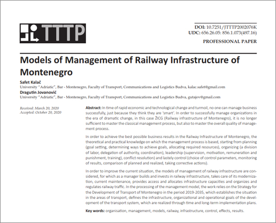 Pored nekoliko ranije objavljenih naučnih radova, Profesoru dr Safetu Kalaču objavljen je u decembarskom broju naučnog časopisa TTTP, Banjaluka, BiH, naučni rad pod naslovom “Models of Management of Railway Infrastructure of Montenegro” autori:  Safet Kalač i Dragutin Jovanović.